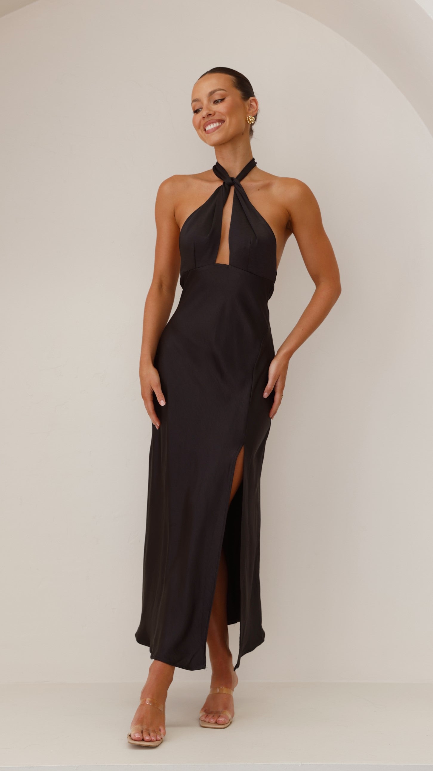 Deze jurk omarmt je silhouet met een flatterende pasvorm, terwijl de open rug en halternek zorgen voor een verfijnde, sensuele touch.
